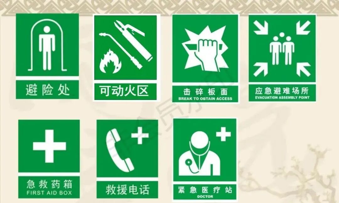 《安全标志及其使用导则》(G( 2894-2008)规)的提示标志共有8个:紧急出口、避险处、应急避难场所、可动火区、击碎板面、急救点、应急电话、紧急医疗站。