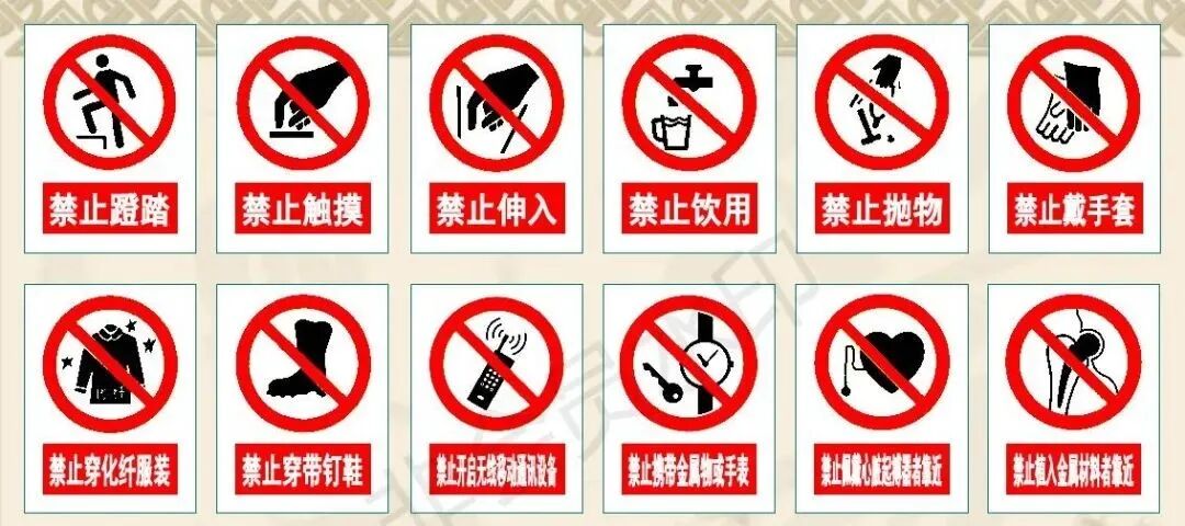 《安全标志及其使用导则》(G( 2894-2008)规)的禁止标志共有40个:禁止吸烟、禁止烟火、禁止带火种、禁止用水灭火、禁止放置易燃物、禁止堆放、禁止启动、禁止合闸、禁止转动、禁止叉车和厂内机动车辆通行、禁止乘人、禁止靠近、禁止入内、禁止推动、禁止停留、禁止通行、禁止跨越、禁止攀登、禁止跳下、禁止伸出窗外、禁止倚靠、禁止坐卧、禁止蹬踏、禁止触摸、禁止伸入、禁止饮用、禁止抛物、禁止戴手套、禁止穿化纤服、禁止穿带钉鞋、禁止开启无线移动通讯设备、禁止携带金属物或手表、禁止佩戴心脏起搏器者靠近、禁止植入金属材料者靠近、禁止游泳、禁止滑冰、禁止携带武器及仿真武器、禁止携带托运易燃及易爆物品、禁止携带托运有毒物品及有害液体、禁止携带托运放射性及磁性物品。