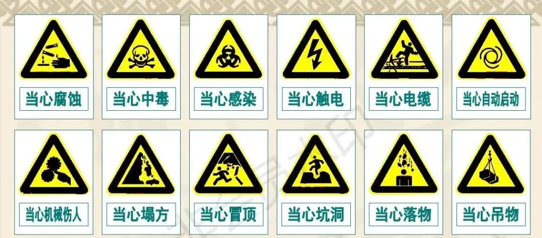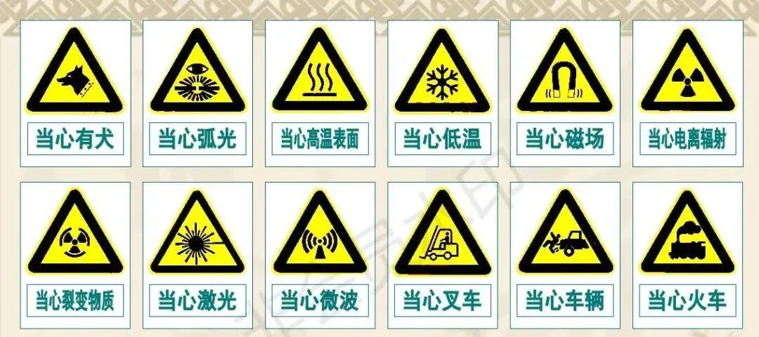 告标志是提醒人们对周围环境引起注意,以避免可能发生危险的图形标志。警告标志的几何图形是黑色的正三角形、黑色符号和黄色背景。