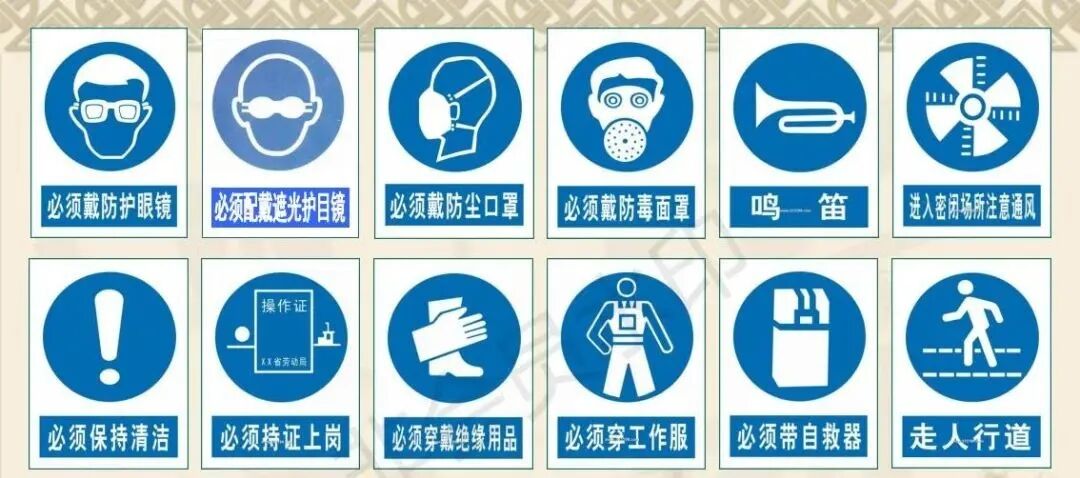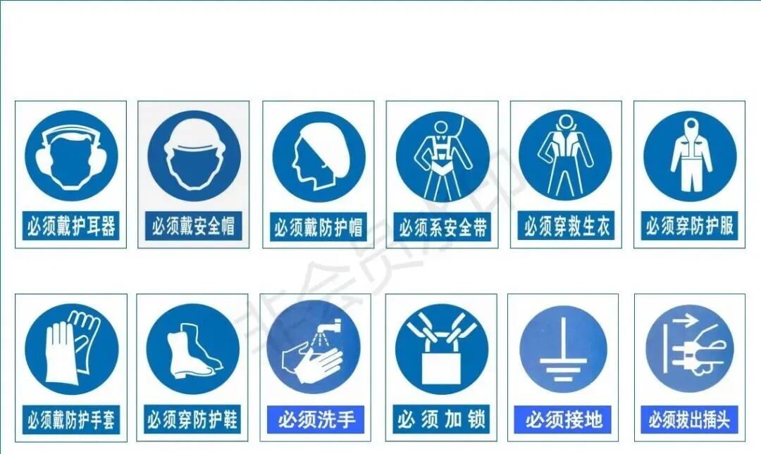 《安全标志及其使用导则》(G( 2894-2008)规)的指令标志共有16个:必须戴防护眼镜、必须佩戴遮光护目镜、必须戴防尘口罩、必须戴防毒面具、必须戴护耳器、必须戴安全帽、必须戴防护帽、必须系安全带、必须穿救生衣、必须穿防护服、必须戴防护手套、必须穿防护鞋、必须洗手、必须加锁、必须接地、必须拔出插头。